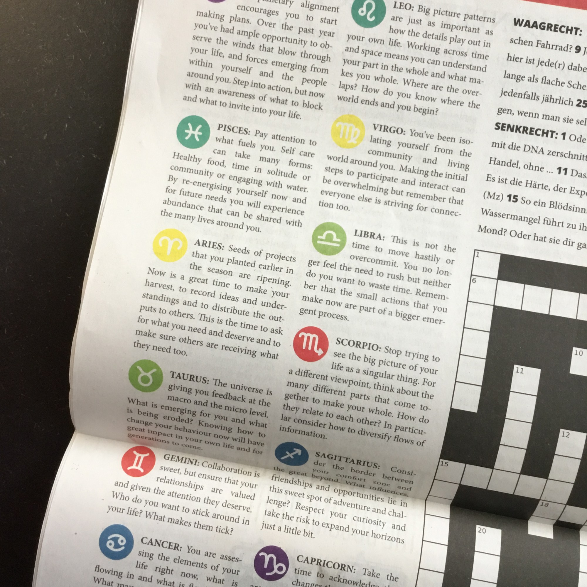 Newspapers often include horoscopes and Tim suggested that I contribute that content. While I am quite interested in planetary alignments and transits and their implications for how to plan gardening and personal activities I am not an astrologer! Instead we decided to use Holmgren’s 12 principles and use them as the basis for each sign’s text.