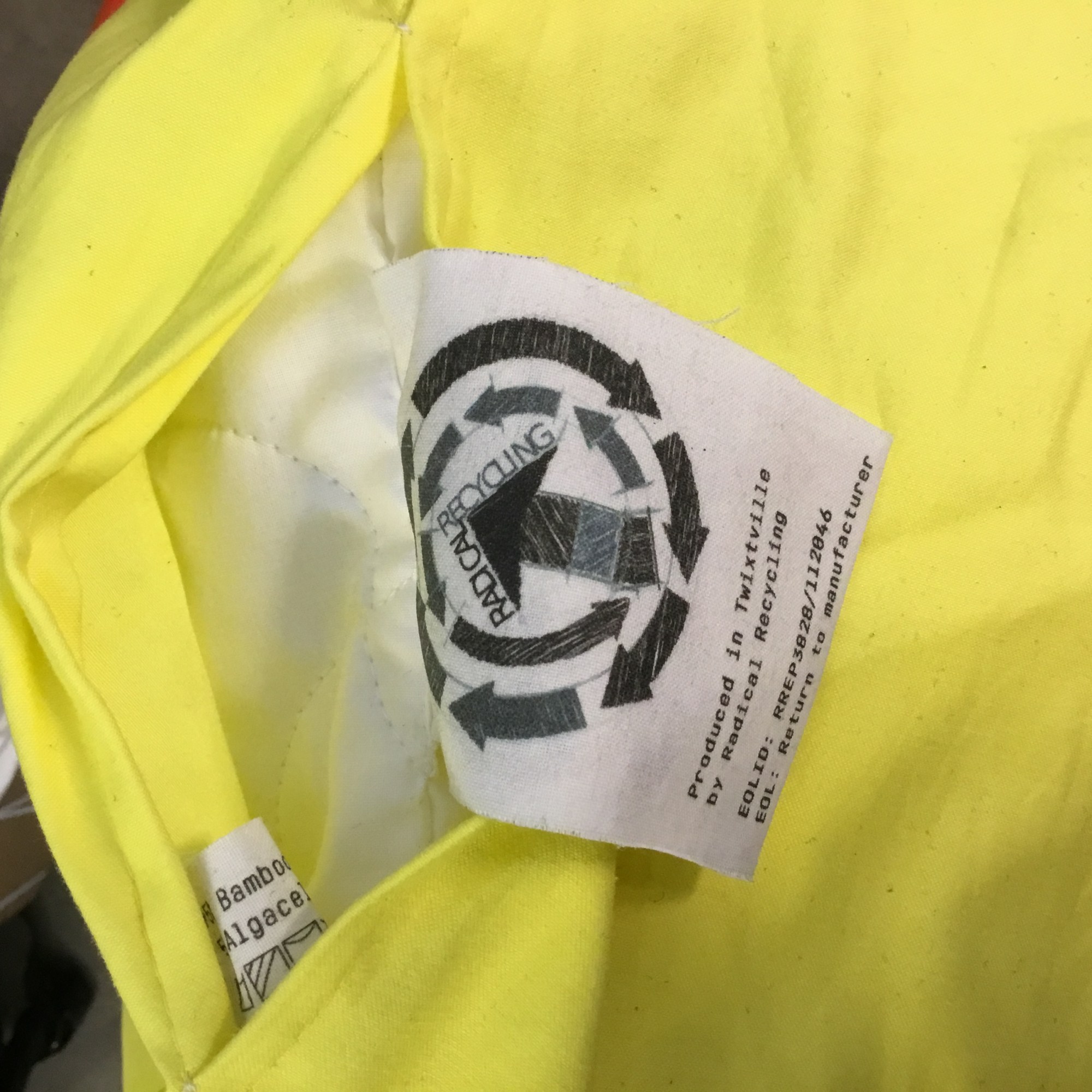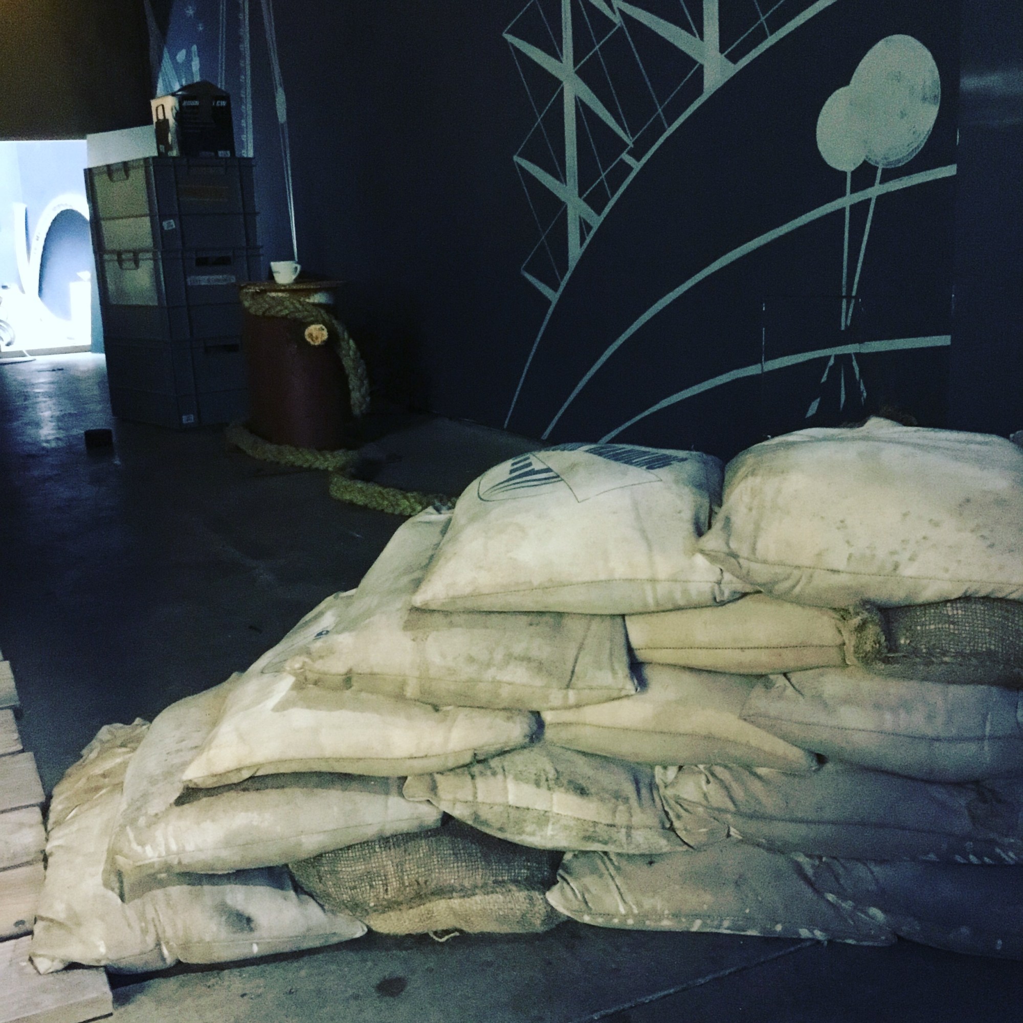 I also helped out with the setup of the exhibition (filling holes and ageing sandbags) and made details like care labels from the future for some of the textile based elements.
