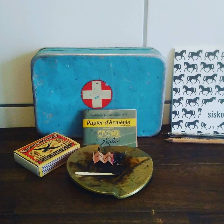 Bathroom survival: mooncup and pad storage (I keep some tampons on hand for visitors who are not yet converted to menstrual cups), Papier d’Arménie and matches because we don’t always smell like roses and notepaper for writing down inspiration. via Instagram http://ift.tt/2hYITyA